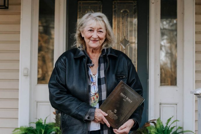 Samaritan’s Purse volunteers present Louisiana homeowner Charlette Neumeier with a Bible signed by the team after working to clear debris that covered her yard after the recent winter storm.