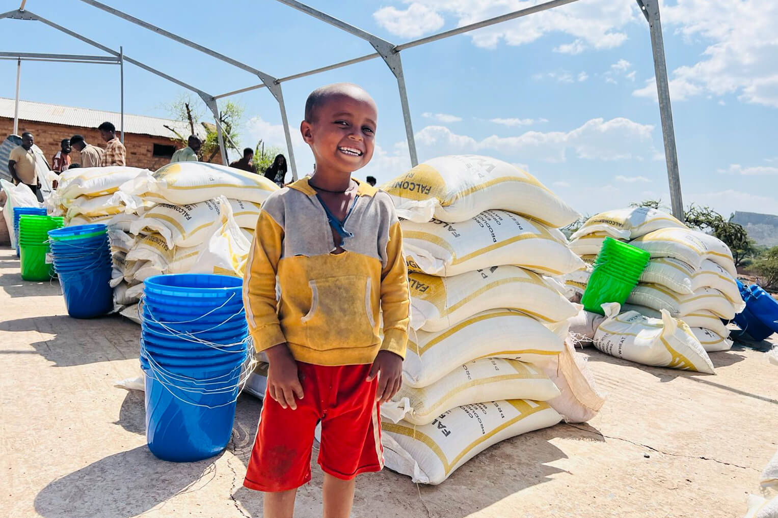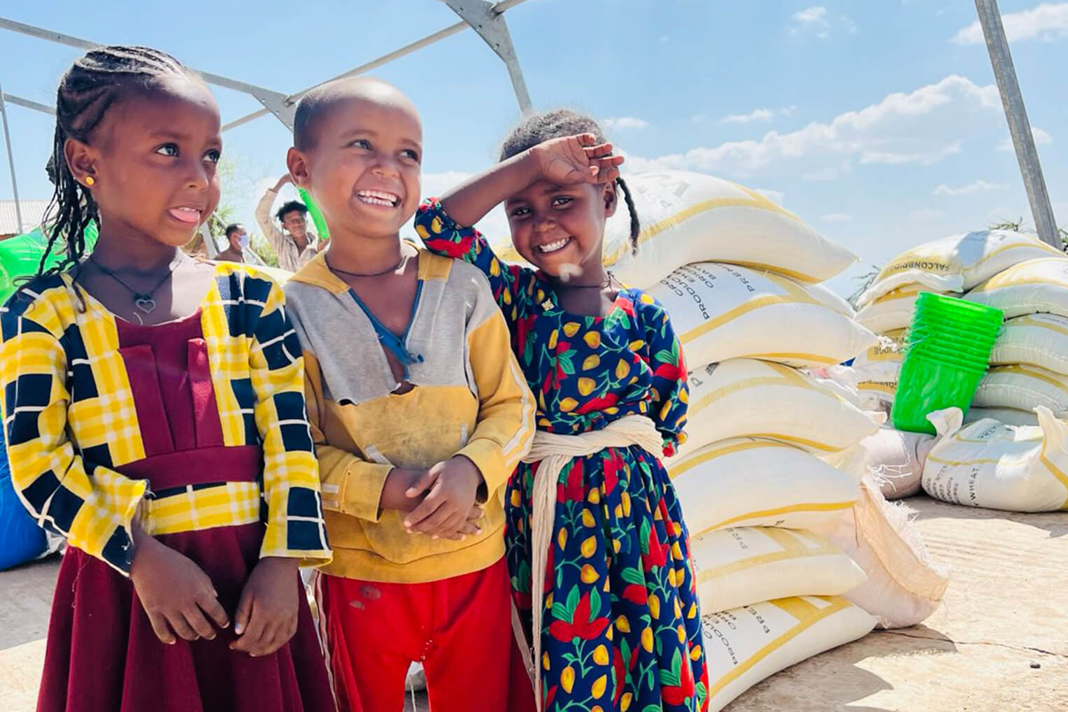 Después de muchas semanas de hambre e incertidumbre, los niños de Yakir Kebele vuelven a sonreír cuando llegan suministros de alimentos de emergencia.