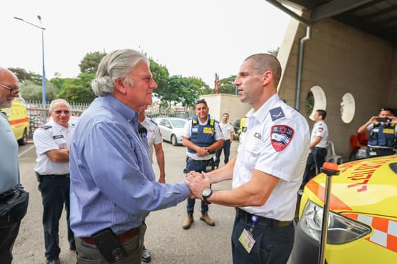 Franklin Graham meets with Magen David Adom, Israel’s national emergency medical service, after delivering one of the more than 40 ambulances pledged by Samaritan’s Purse to replace those destroyed in attacks by Hamas.