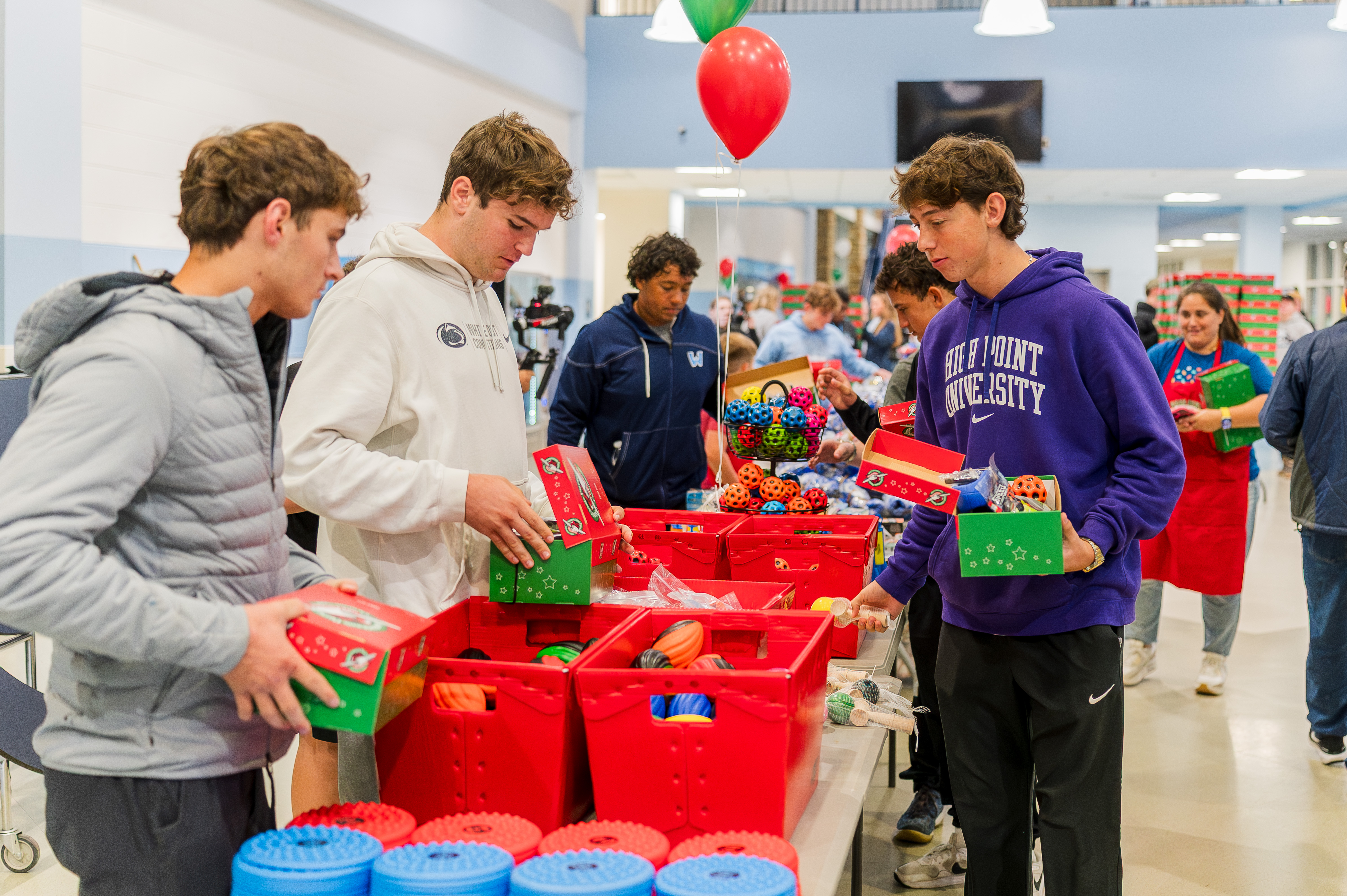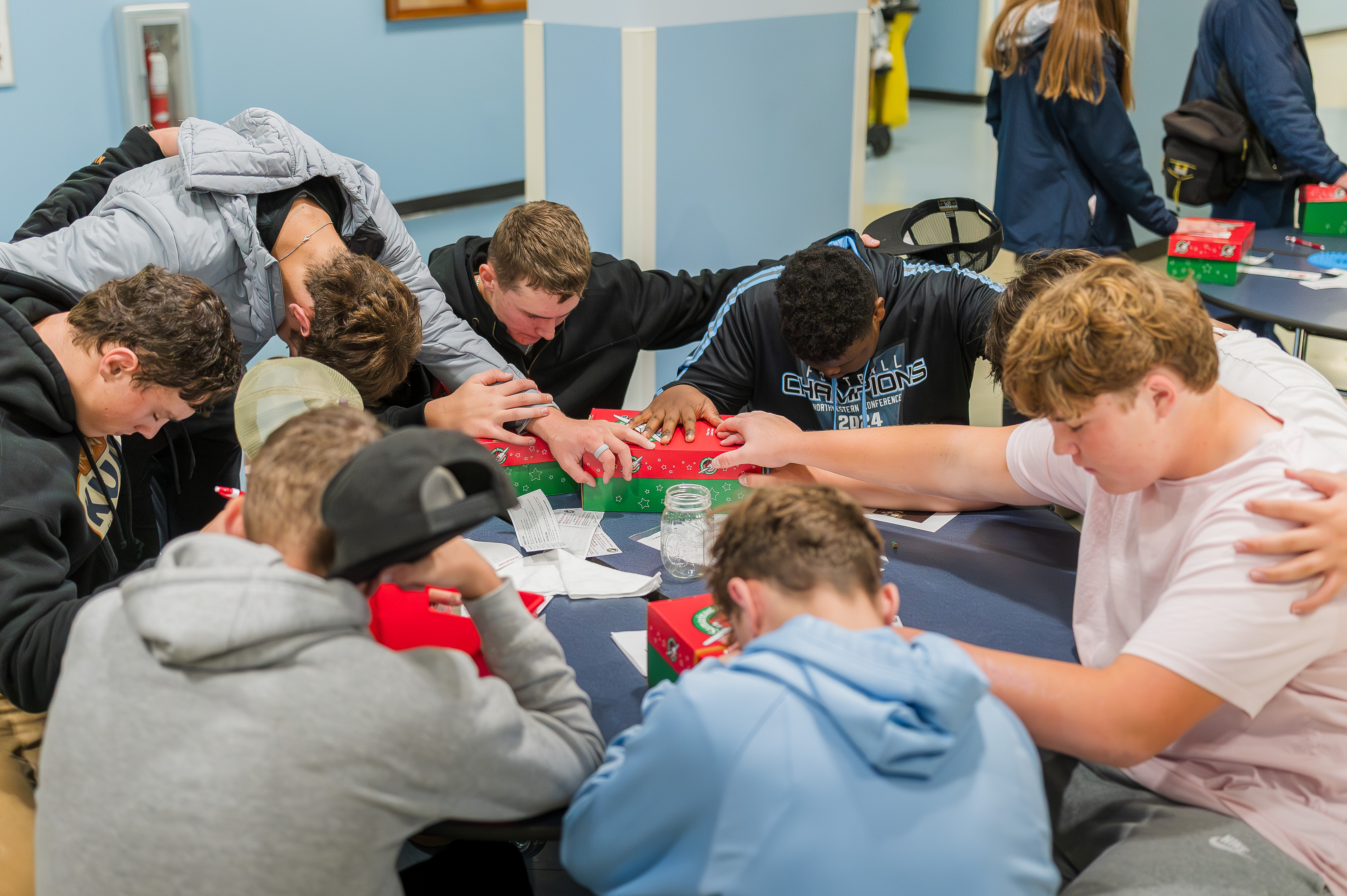 Members of the Watauga High School football team of Boone, North Carolina, carefully select just the right items for each child who will receive a shoebox.