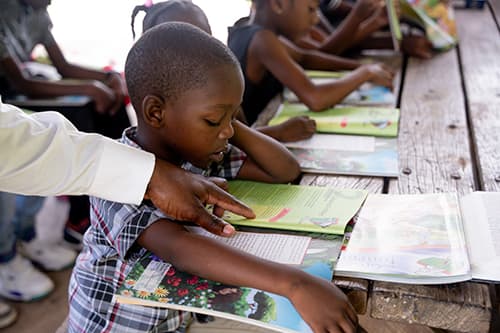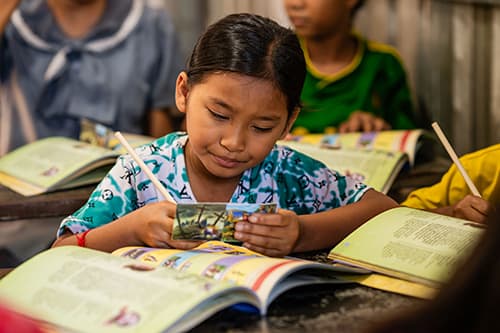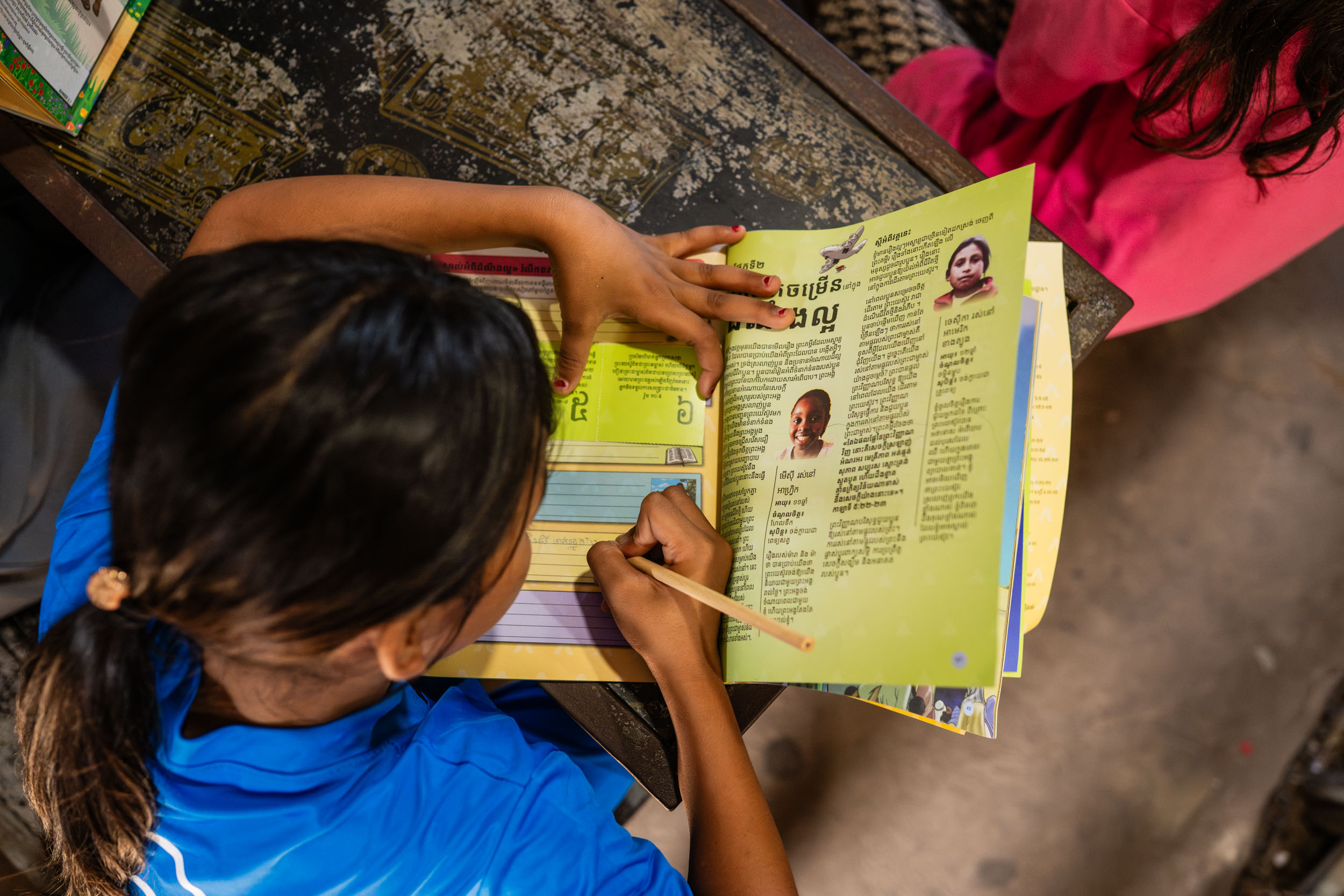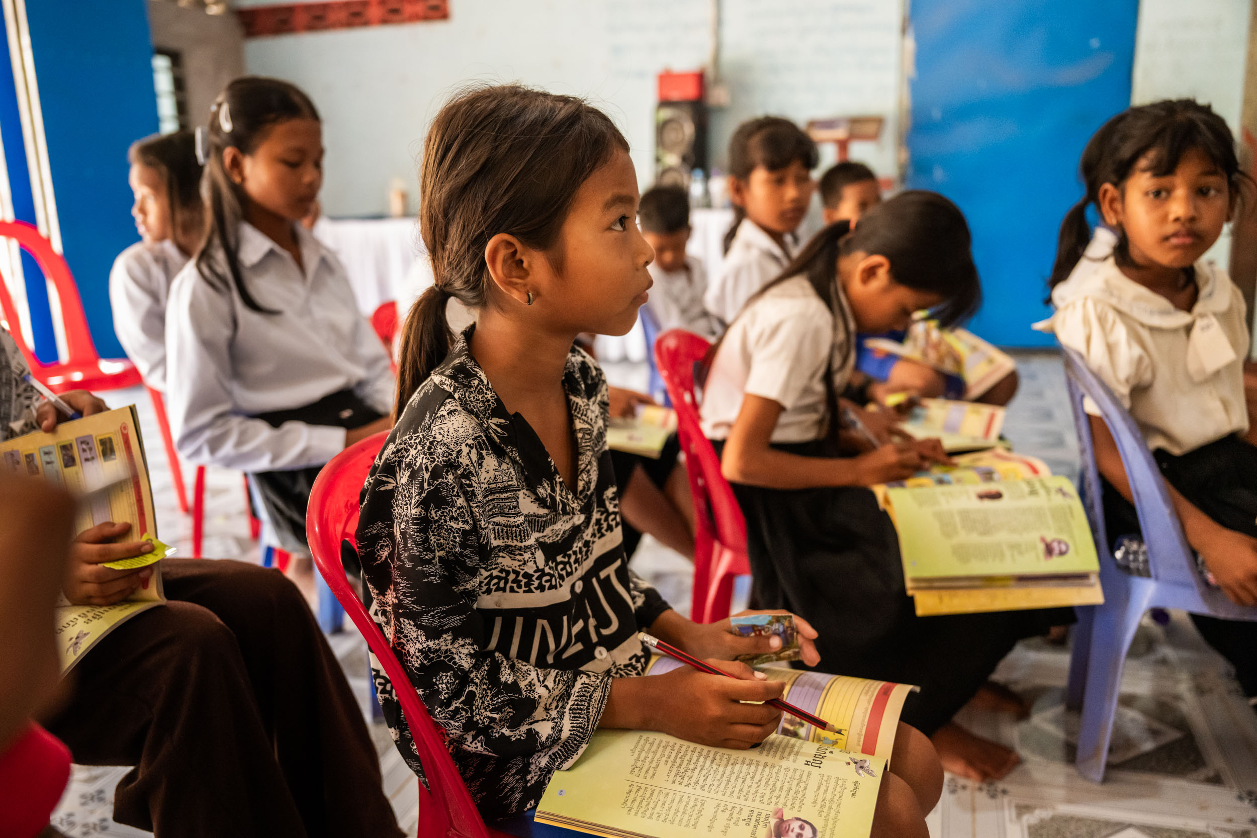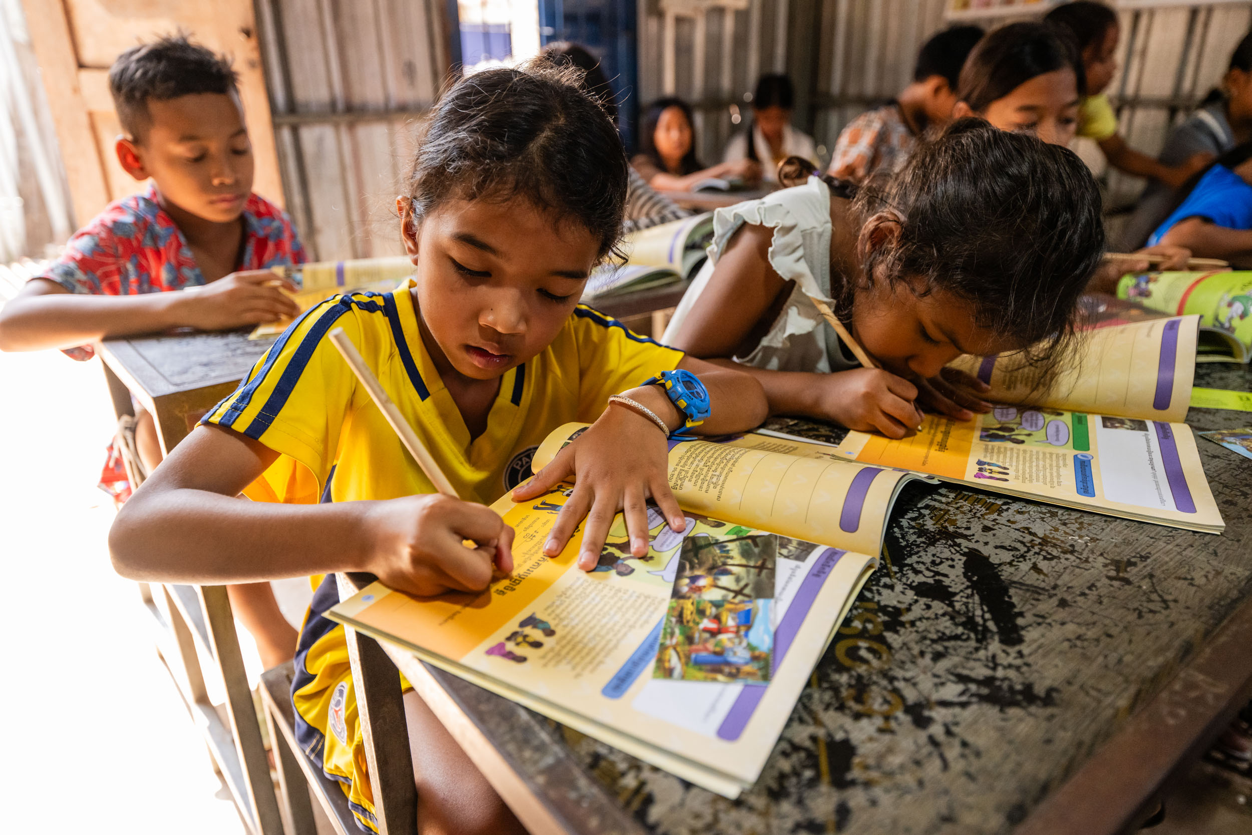 Children in Cambodia intently work through discipleship lessons in The Greatest Journey student workbooks.
