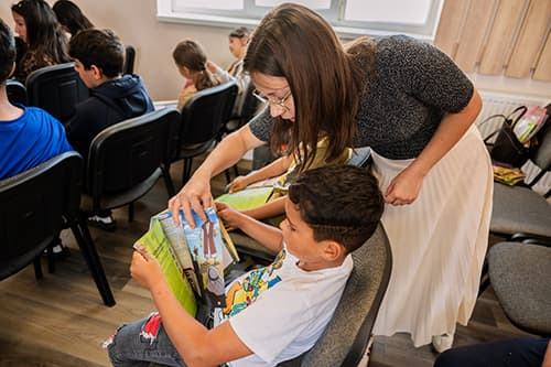 A teacher in Romania helps a participant in The Greatest Journey navigate his colorful student workbook.