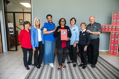 A year-round volunteer shows off her latest purchase from the wide variety of Operation Christmas Child apparel available.