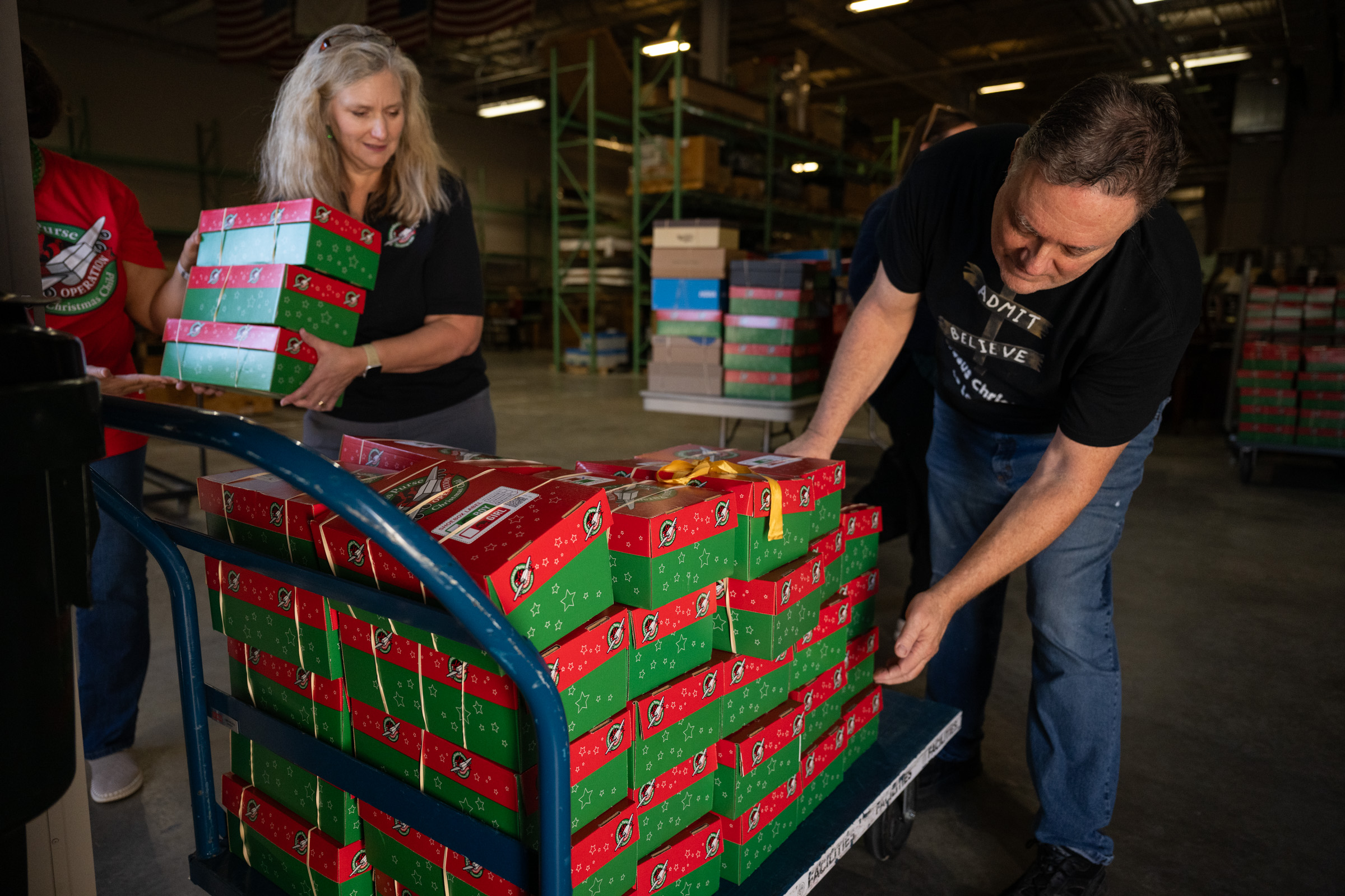 It takes a team of volunteers to assemble the hundreds of thousands of shoebox gifts packed online each year.