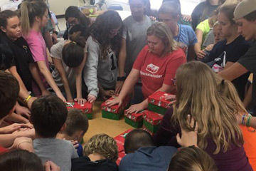 Jill (center, in red) prays with a group of students over the shoebox gifts they packed.