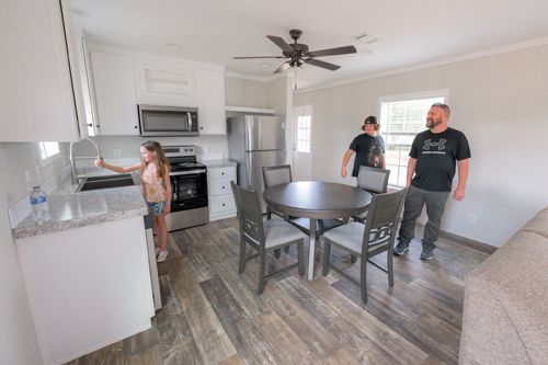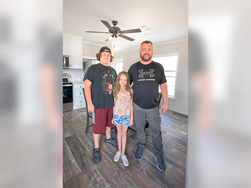 Josh Hatcher with his 14-year-old son Jaiden and 10-year-old daughter Faith touring the type of home they will receive in the coming weeks. Josh's family lost their home in February to a house fire and only a few weeks later lost their new mobile home in the March 24 tornado. Download  -