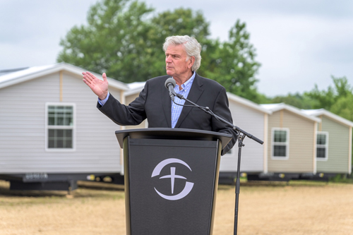 Franklin Graham, president and CEO of Samaritan's Purse addresses the crowd of homeowners who will receive a free mobile home. Download  -